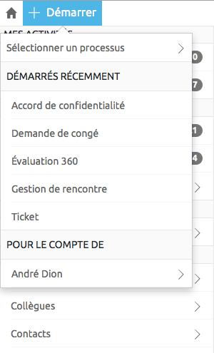 Démarrer un processus À partir d’un Espace, cliquer sur le bouton + Démarrer puis sélectionner parmi la liste des processus qui vous sont disponibles, celui que vous souhaitez démarrer. Tagged: Comment faire